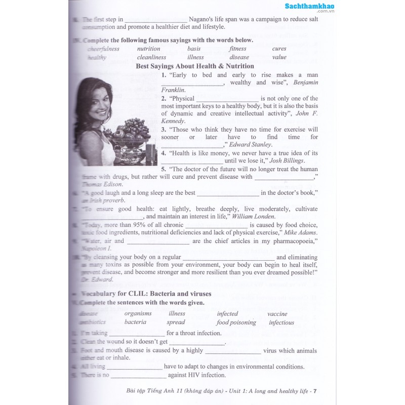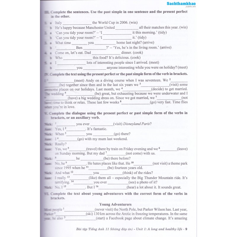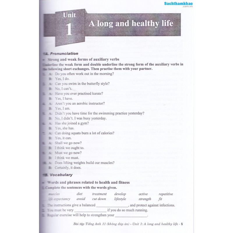 Bài tập dành cho mỗi đơn vị bài học gồm 6 phần: Phonunciation, Vocabulary, Grammar, Speaking, Reading, Writing và một bài ôn tập dưới dạng Test 1 và Test 2 gồm 50 câu hỏi kiểm tra với bài tập phát triển kỹ năng trên.