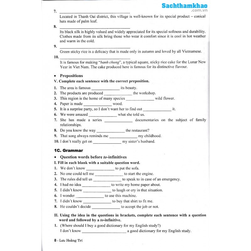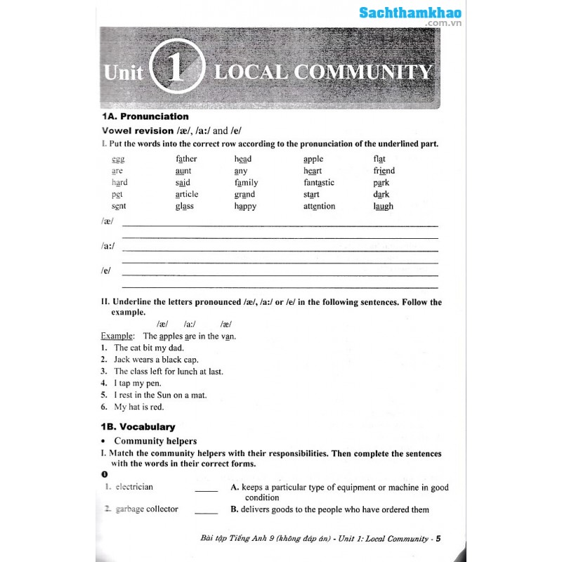 Bài tập dành cho mỗi đơn vị bài học gồm 6 phần: Phonunciation, Vocabulary, Grammar, Speaking, Reading, Writing và một bài ôn tập dưới dạng Test gồm 50 câu hỏi kiểm tra với bài tập phát triển kỹ năng trên.
